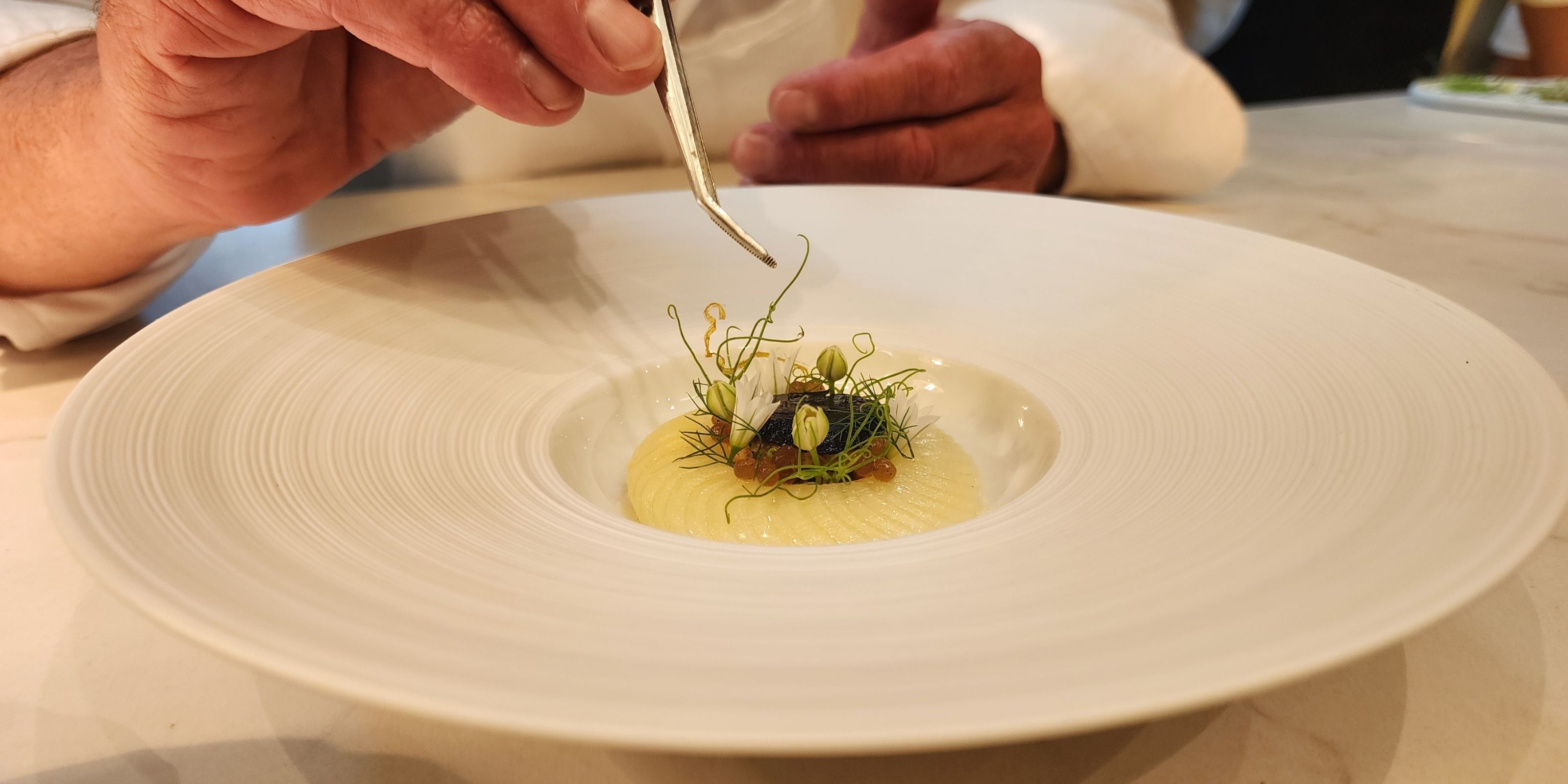 Depuis sa cuisine en plein centre de Malaga, Emiliano nous guide étape par étape à travers cette création élégante et parfumée, qui rend hommage à la délicatesse du produit et à la technique bien exécutée.